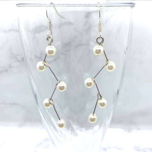 ジグザグに並んだパールが耳元で揺れて動きのある耳元になります。 華奢なモチーフながら揺れ感があって存在感のあるピアスです。 シンプルなので大人女子にもオススメ。 ■サイズ:15mm×62mm ■パーツ変更:樹脂ピアス(○)、イヤリング(○)、シルバー↔ゴールド(○)、パール↔コットンパール(○)