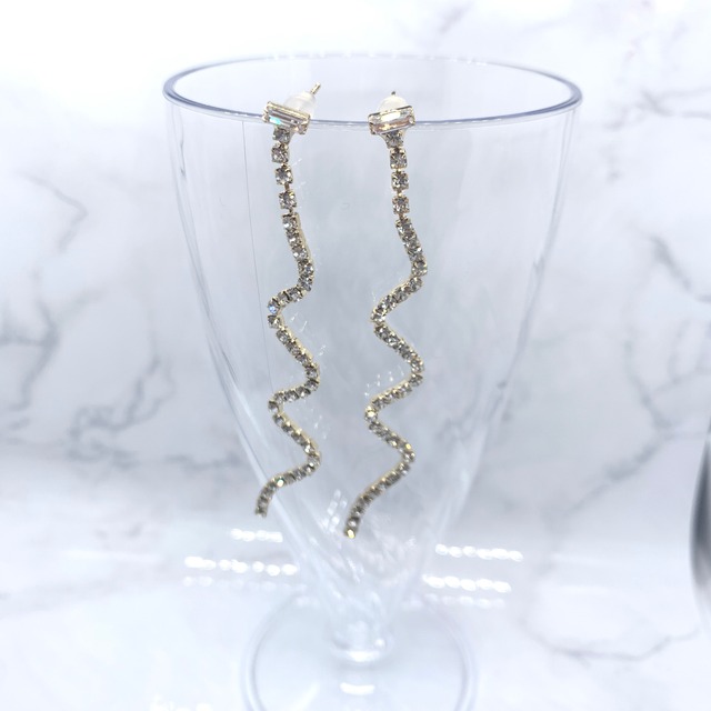 ウェーブラインが特徴の連爪ダイヤチェーンのピアスです。 キラキラと光るダイヤがお顔周りのアクセントになります。 フォーマルなシーンでも使いやすいピアスです。 ■先端部分のマルカンやガラスの台座は高品質銅製品使用。 ■ダイヤチェーン:太さ2mm、A級ガラスストーン使用 ■サイズ:長さ70mm ■パーツ変更:樹脂ピアス(×)、イヤリング(×)