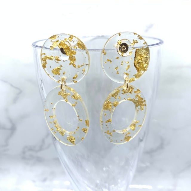 金箔がキラキラ光る存在感のあるピアスです。 クリアな素材のため、お洋服のお色問わずお使いできます。 ■サイズ:22mm×50mm ■パーツ変更:樹脂ピアス(○)、イヤリング(○)