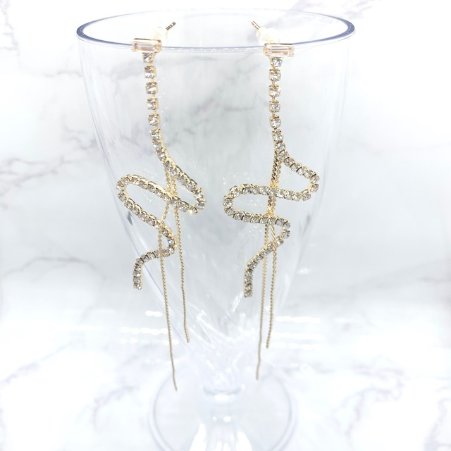 ウェーブラインが特徴の連爪ダイヤチェーンを組み合わせたピアスです。 キラキラと光るダイヤがお顔周りのアクセントになります。 フォーマルなシーンでも使いやすいピアスです。 ■先端部分のマルカンやガラスの台座は高品質銅製品使用。 ■ダイヤチェーン:太さ2mm、A級ガラスストーン使用 ■サイズ:長さ100mm ■パーツ変更:樹脂ピアス(×)、イヤリング(×)