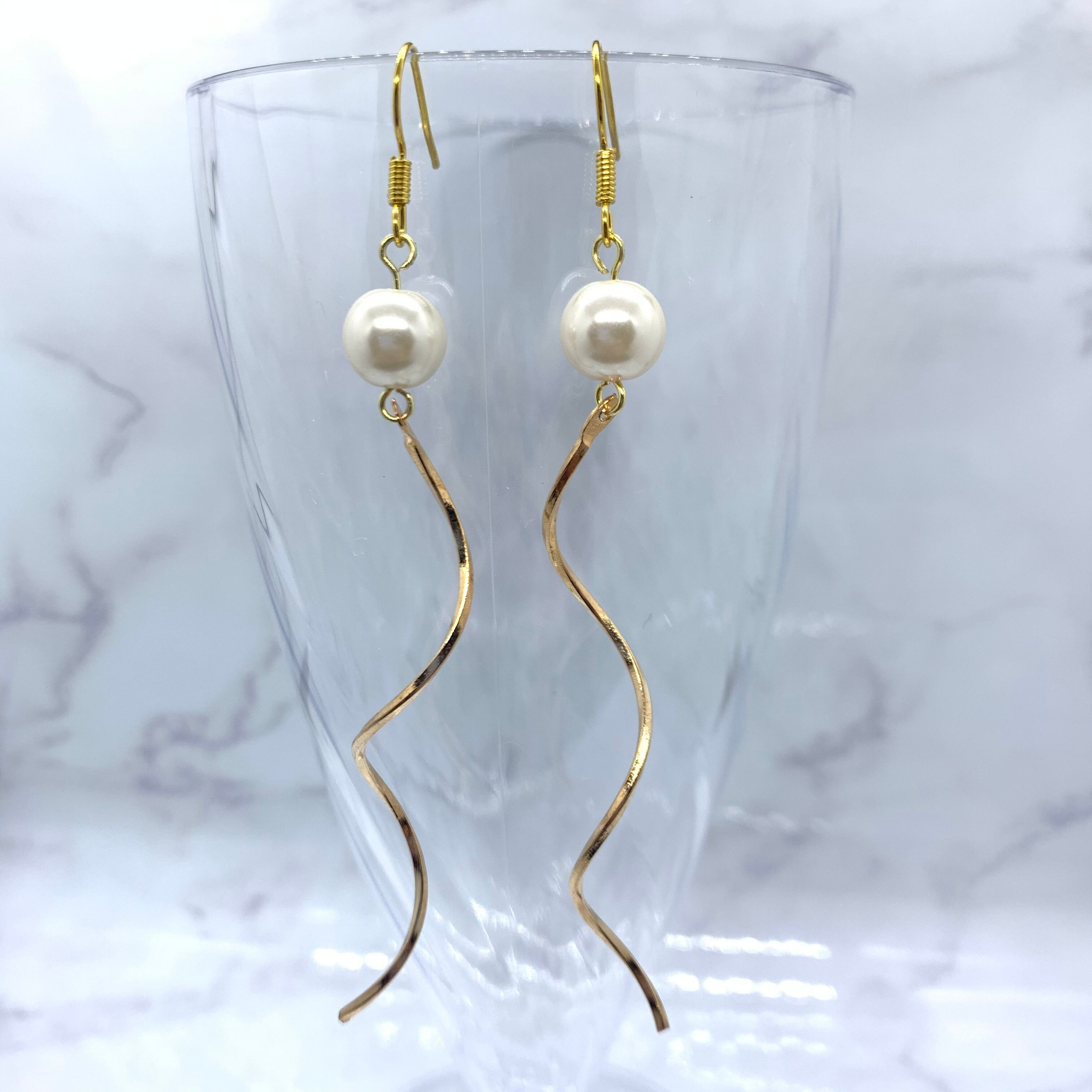ゆるやかなウェーブラインのチャームとパールを組み合わせたピアスです。